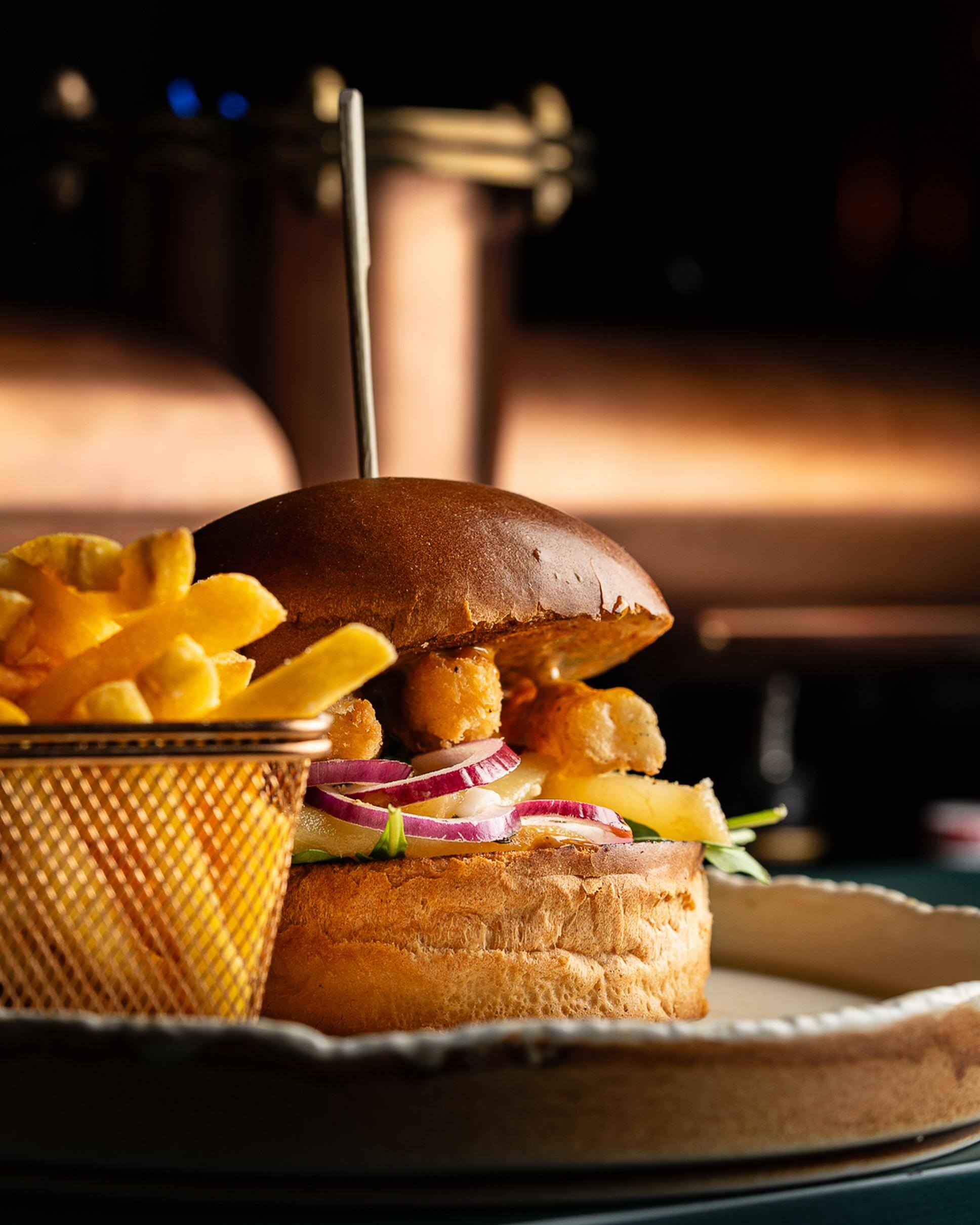 Nasz lokal zachwyca przestronnym, wielopoziomowym wnętrzem, które łączy industrialny charakter browaru z przytulnością rodzinnej restauracji. Już przy wejściu wita Cię imponująca warzelnia – serce naszego browaru – która nadaje Alterii niepowtarzalny charakter. Wysokie sufity, stylowe oświetlenie i wygodne miejsca przy drewnianych stołach tworzą przestrzeń idealną zarówno na kameralne kolacje, jak i większe spotkania w gronie bliskich. Dzięki temu wyjątkowemu klimatowi, pełnemu aromatu świeżo warzonego piwa i apetycznych zapachów z kuchni, każda wizyta w Alterii na długo pozostaje w pamięci.